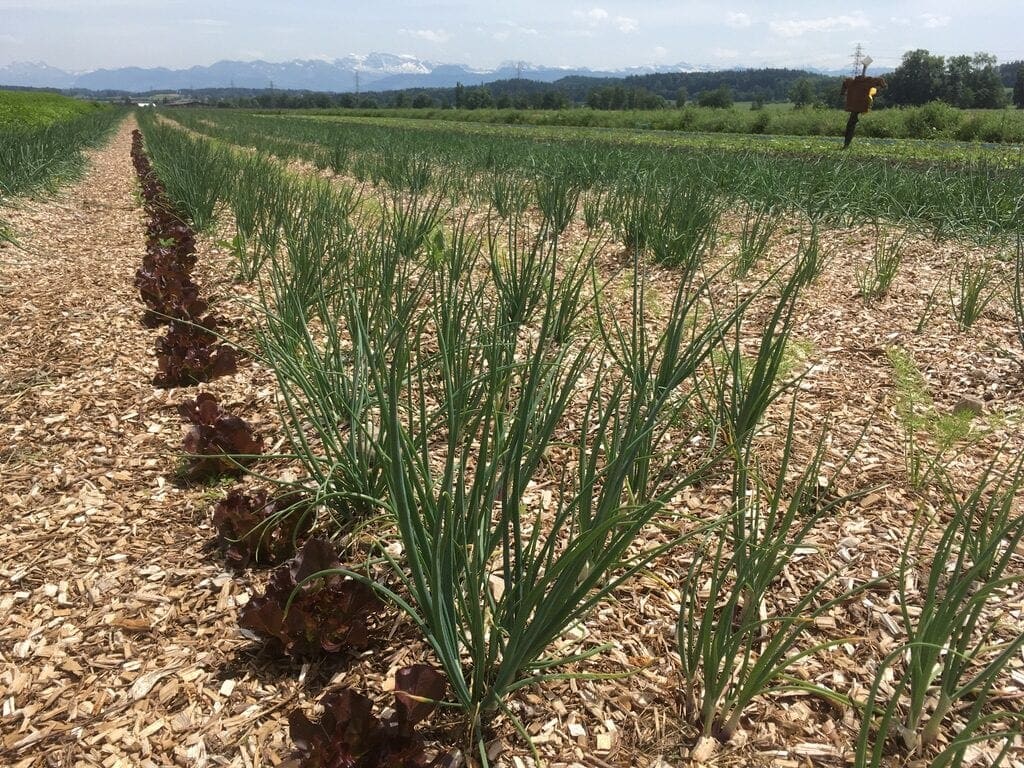 Wenige Tage später stehen Nicolas und ich auf dem Acker von SlowGrow. Was wir sehen, beeindruckt uns beide sehr: Während Nicolas versucht den tiefschwarzen, lockeren Boden fotografisch festzuhalten, erzählt mir Matthias vom Experiment mit den Zwiebeln. „Die Zwiebeln sind eine Kultur, welche selbst im Bioanbau nur mit viel Bodenbearbeitung und Spritzmitteln über die Runden kommt.“ sagt er. „Wir suchten nach einem anderen System: Nachdem wir die Steckzwiebeln gesteckt hatten, deckten wir das schnell spriessende Unkraut mit geschnittenem Gras und mit Holzschnitzeln zu. Während Gras und Holzschnitzel so langsam kompostiert wurden, wuchsen die Zwiebeln unbeirrt durch die Schnitzeldecke.» So werden die Zwiebeln mit reichlich Nährstoffen aus dem Gras-Schnitzel-Kompost versorgt. Auf das Jäten und Hacken konnte dagegen weitgehend verzichtet werden. Nun stehen wir auf dem abgeernteten Feld, wo noch vereinzelt Zwiebeln stecken. Viel ist bereits wieder zugewachsen. Doch bei näherer Betrachtung entdecken wir eine Vielzahl von Insekten und Regenwürmern, die sich im weichen Hummus tummeln.