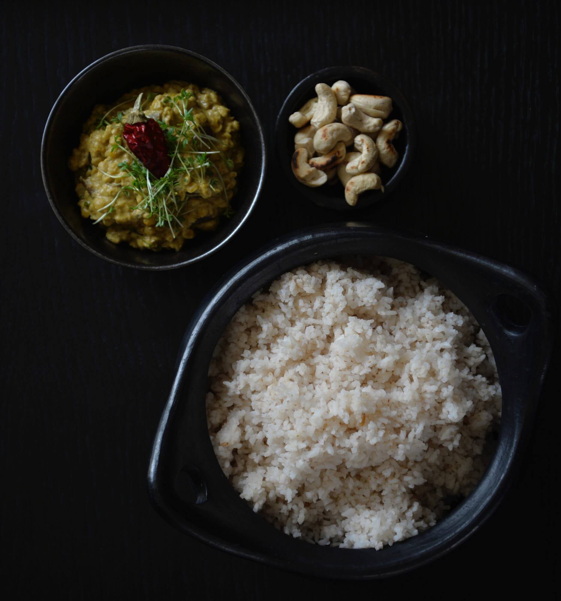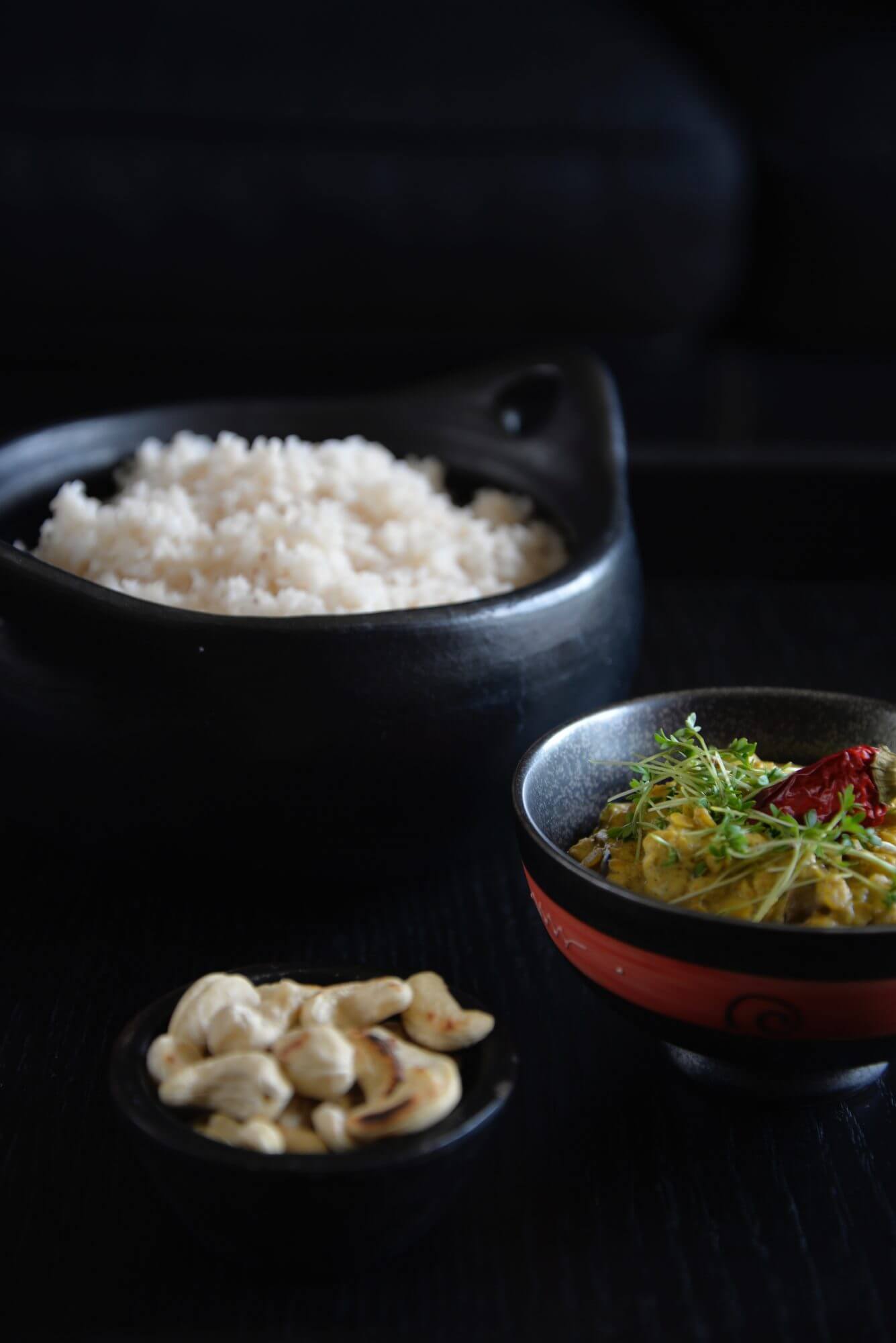 Den Reis kochen, anrichten und das Curry darüber geben, mit frischen Kräutern und den Cashewnüssen dekorieren.