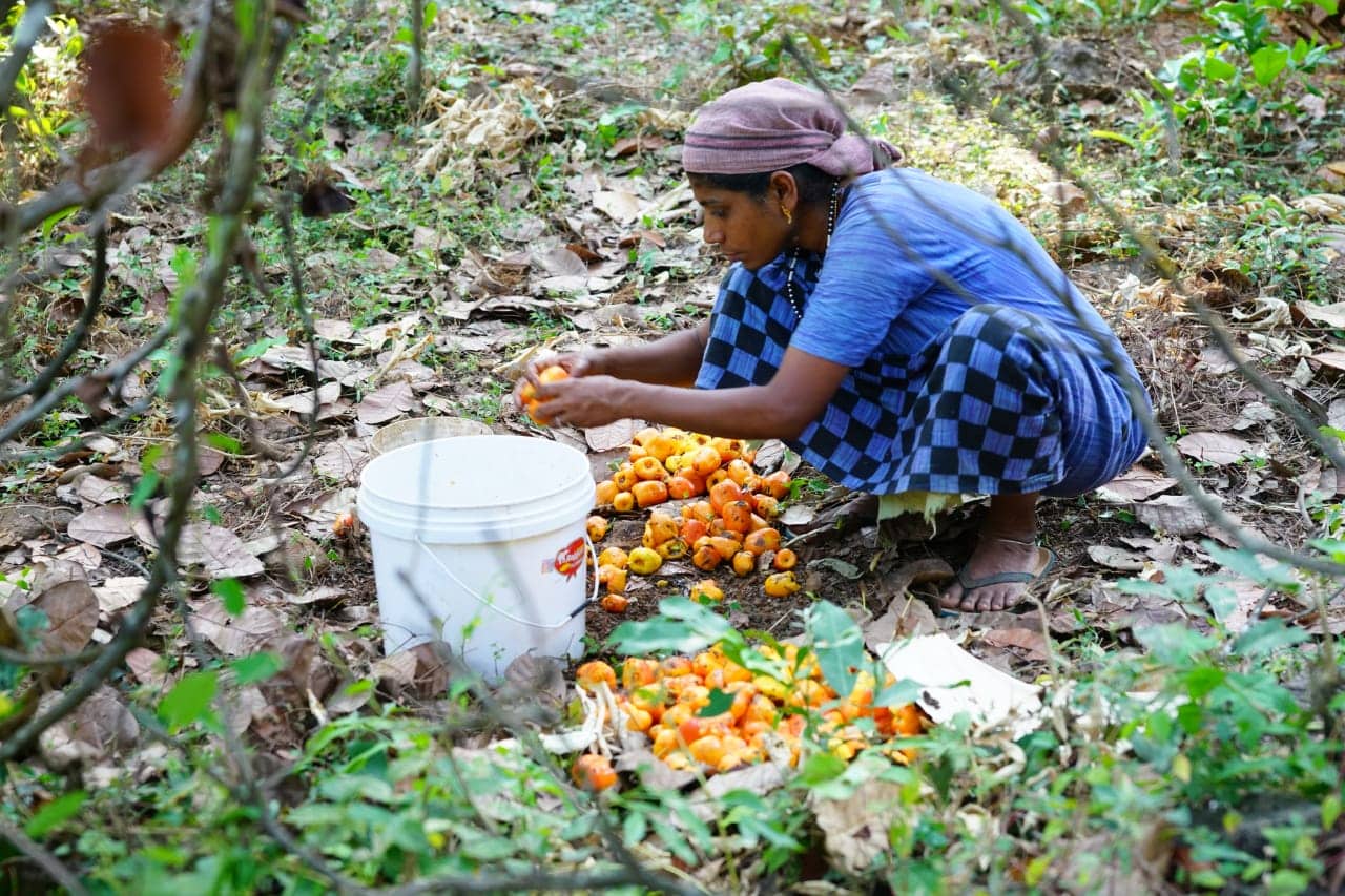 • Produzent*innen: Die kleinen Bauernhöfe der Mitglieder der «Fair Trade Alliance Kerala» sind im Durchschnitt gerade Mal eine Hektare gross. Die Bäuer*innen bauen eine grosse Vielfalt an Produkten für den Export, für die lokalen Dorfmärkte, aber auch für sich selbst an. Das Knacken der Cashewkerne erfolgt heute ausschliesslich maschinell, sodass eine wichtige Quelle für Gesundheitsrisiken nicht mehr besteht. Aber die Kerne müssen immer noch aus der Schale gelöst werden und das geschieht von Hand. Dabei besteht die Gefahr, dass das natürliche Gift der Schalen auf die Hände gelangt und schwere Verätzungen verursacht. Tomy Mathew ist der Gründer der Kooperative «Fair Trade Alliance Kerala». Er setzt sich seit Jahren erfolgreich für die Arbeiter*innen in der Region und deren Bedingungen ein. Zum Beispiel wurden Handschuhe oder Rizinusöl, das auf die Hand aufgetragen wird, in den Betrieben als Standards eingeführt.