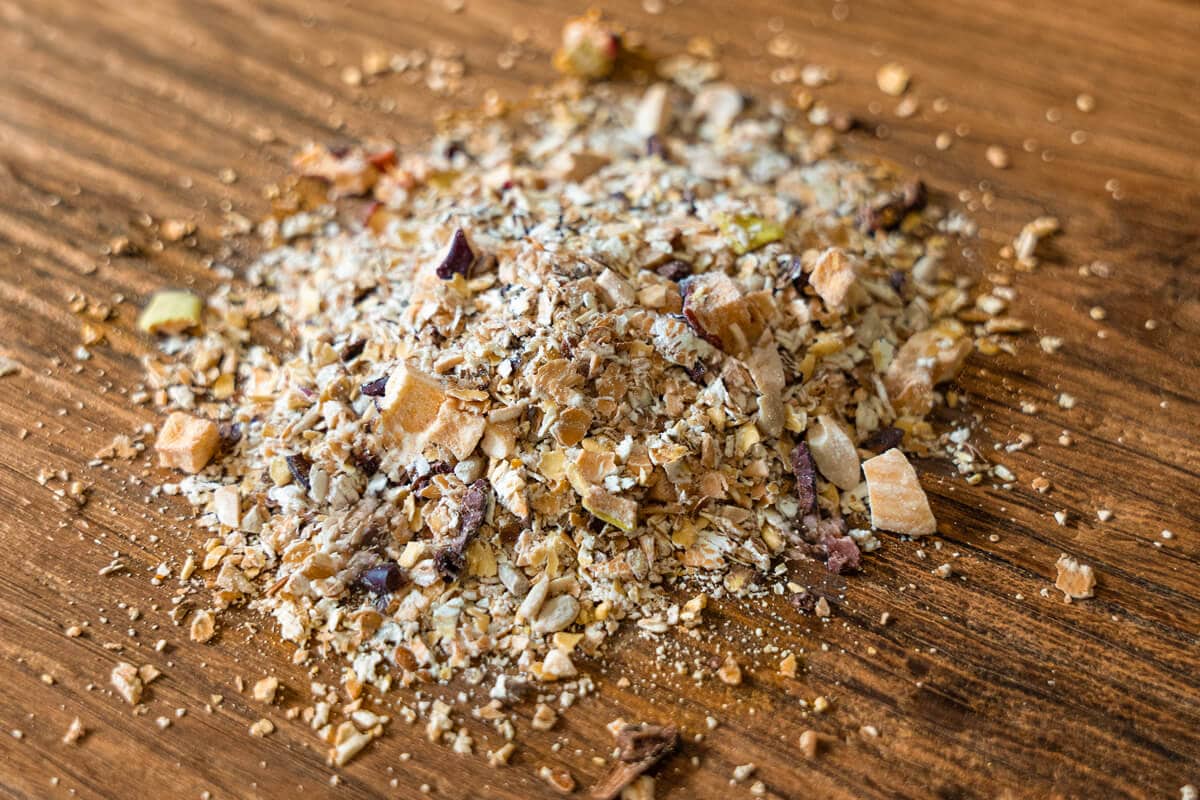 | Zutaten | Hafer 23%, Dinkel 16%, Emmer 16%, Apfelwürfel 12%, Haferkleie 9%, Schwarze Gerste 8.5%, Leinsamenschrot 5.5%, Mandeln 5%, Cacao Nibs 5% |