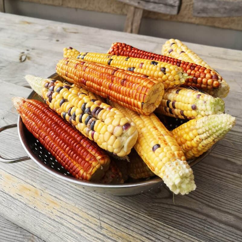 - Anbaumethode: Biologische Landwirtschaft. Die Mischung der Landmaissorten für diese Polenta wurde von Egon Tschol vom Aspehof in jahrelangen Versuchen herausgetüftelt. Im Jahr 2020 durfte der Grüthof das wertvolle Saatgut übernehmen. Im Gegensatz zu Hybridmais sind die Populationssorten vom Grüthof natürlich vermehrbar. Sie umfassen eine viel grössere genetische Vielfalt, welche in den vielen Farben und Formen der Maiskörner am Kolben zum Ausdruck kommt.
