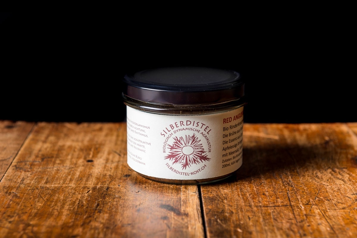- Qualitätsmerkmale: Die Knochenbrühe wird auf dem Hof «Silberdistel» aus den angerösteten Knochen der Angus Rinder, etwas Apfelessig und Gewürzen hergestellt. Sie gilt als ein stärkendes Lebensmittel.