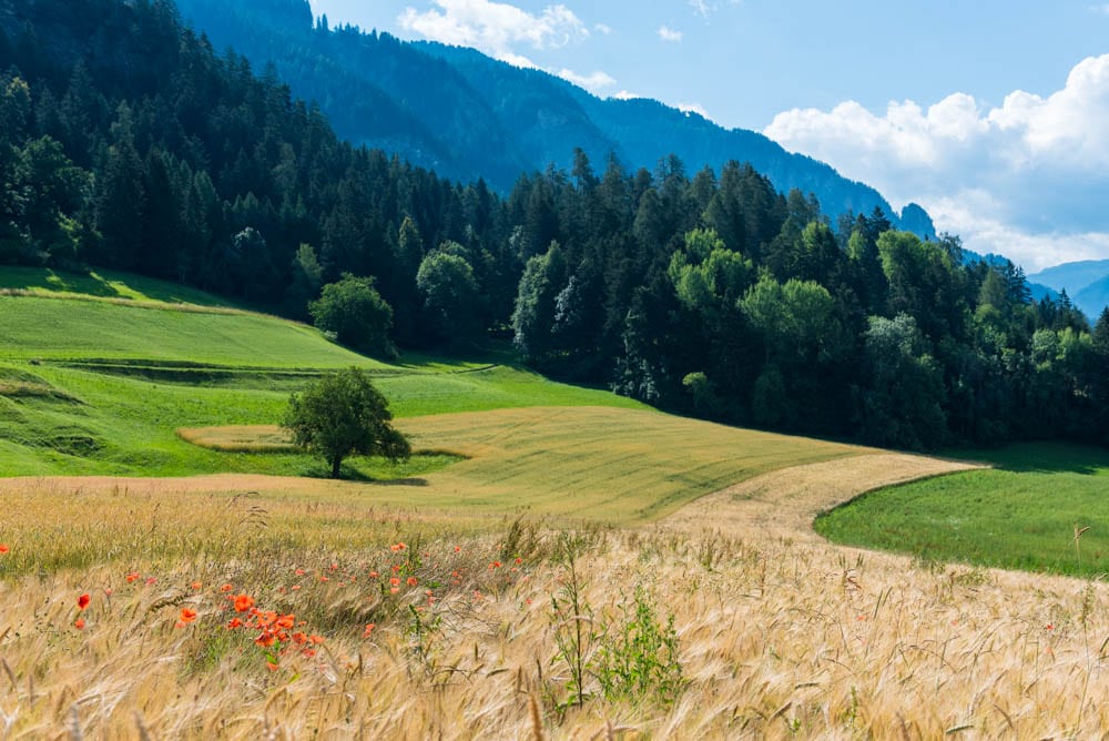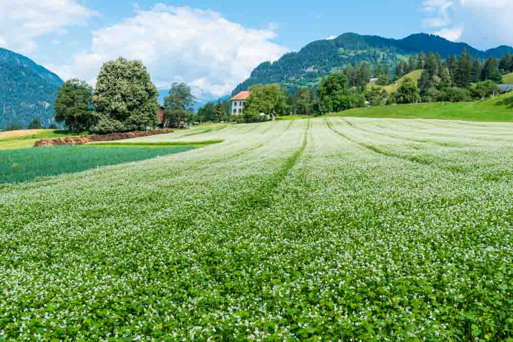 - Anbaumethode: Biologisch-dynamische Landwirtschaft. Buchweizen ist eine Kultur, die sich optimal für den Bio-Anbau eignet. Die weiss blühenden Buchweizenfelder bieten vielen Insekten eine willkommene Nahrungsquelle. Zudem benötigt Buchweizen keinen Dünger – im Gegenteil: Er besitzt die Fähigkeit, aus dem Boden Phosphor freizusetzen, von dem die Folgekultur profitiert. 2021 hat Georg Blunier zum ersten Mal den Anbau von Hartweizen im Domleschg versucht und das mit Erfolg.