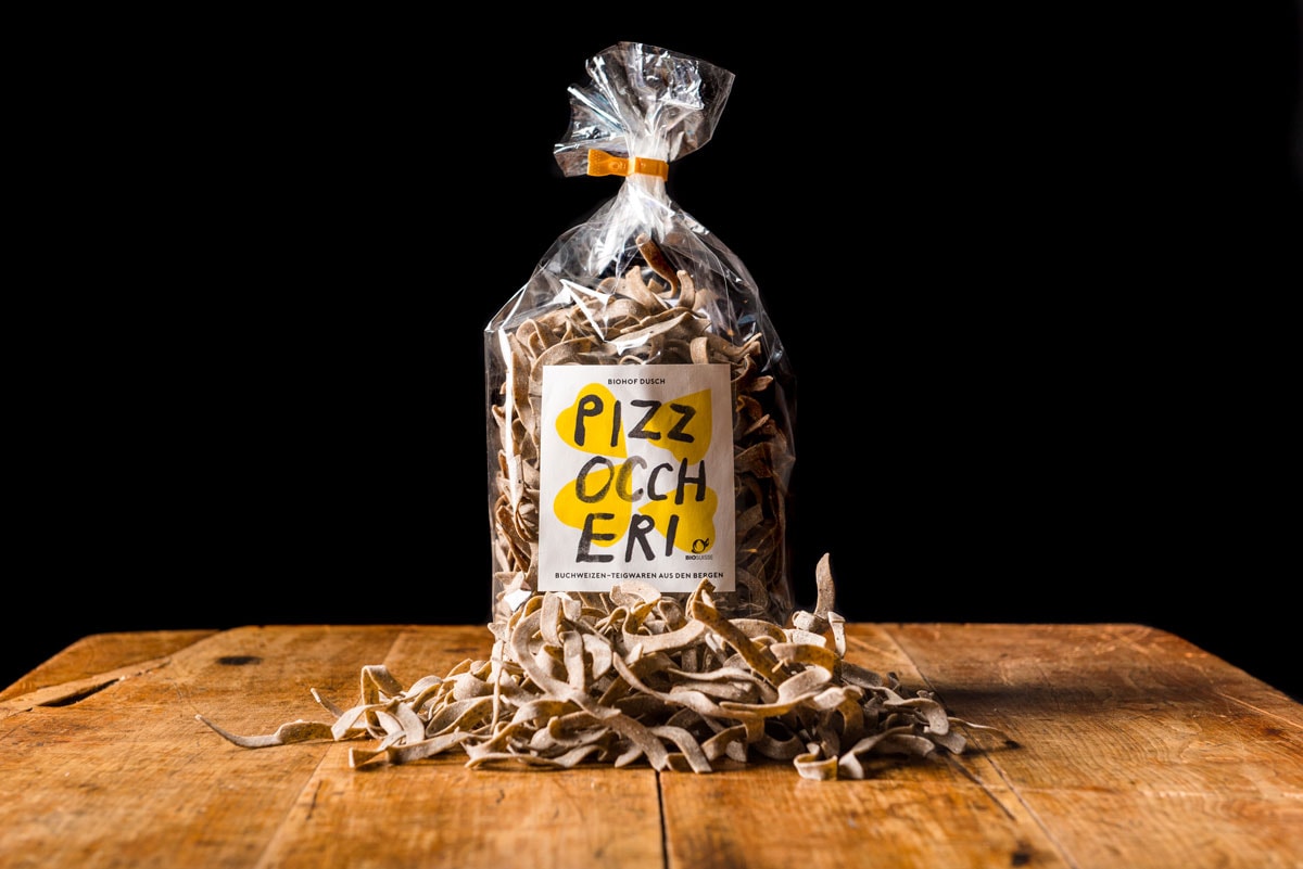Das Spezielle an diesen Schweizer Teigwaren: Neben dem Buchweizen stammt auch der verwendete Hartweizen aus dem Bündnerland. Der Versuch der Familie Blunier-Hanimann mit biologisch-dynamischem Anbau von Hartweizen im Domleschg war ein voller Erfolg. Ob in traditioneller Zubereitung mit Wirz und Käse oder in neuer Kombination – diese Pizzoccheri schmecken wunderbar!
