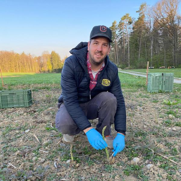 - Produzent*innen: Patrick und Sara Guarisco haben ihren Hof in Wilen bei Neunforn von Saras Eltern übernommen. Sie betreiben eine vielfältige, innovative Landwirtschaft auf dem 15 Hektar grossen Land: Neben den Spargeln wachsen dort auch Beeren, Kürbisse, alte Getreidesorten und pilzresistente Trauben der Sorte «Souvignier Gris». Saras Bruder und ihr Vater unterstützen die beiden bei der vielen Arbeit, die auf dem Hof anfällt. Dazu gehören auch das tägliche Ernten und Rüsten der Spargeln während der Saison. Neben der Landwirtschaft betreibt die Familie einen Hofladen und Sara gibt Yoga-Kurse.